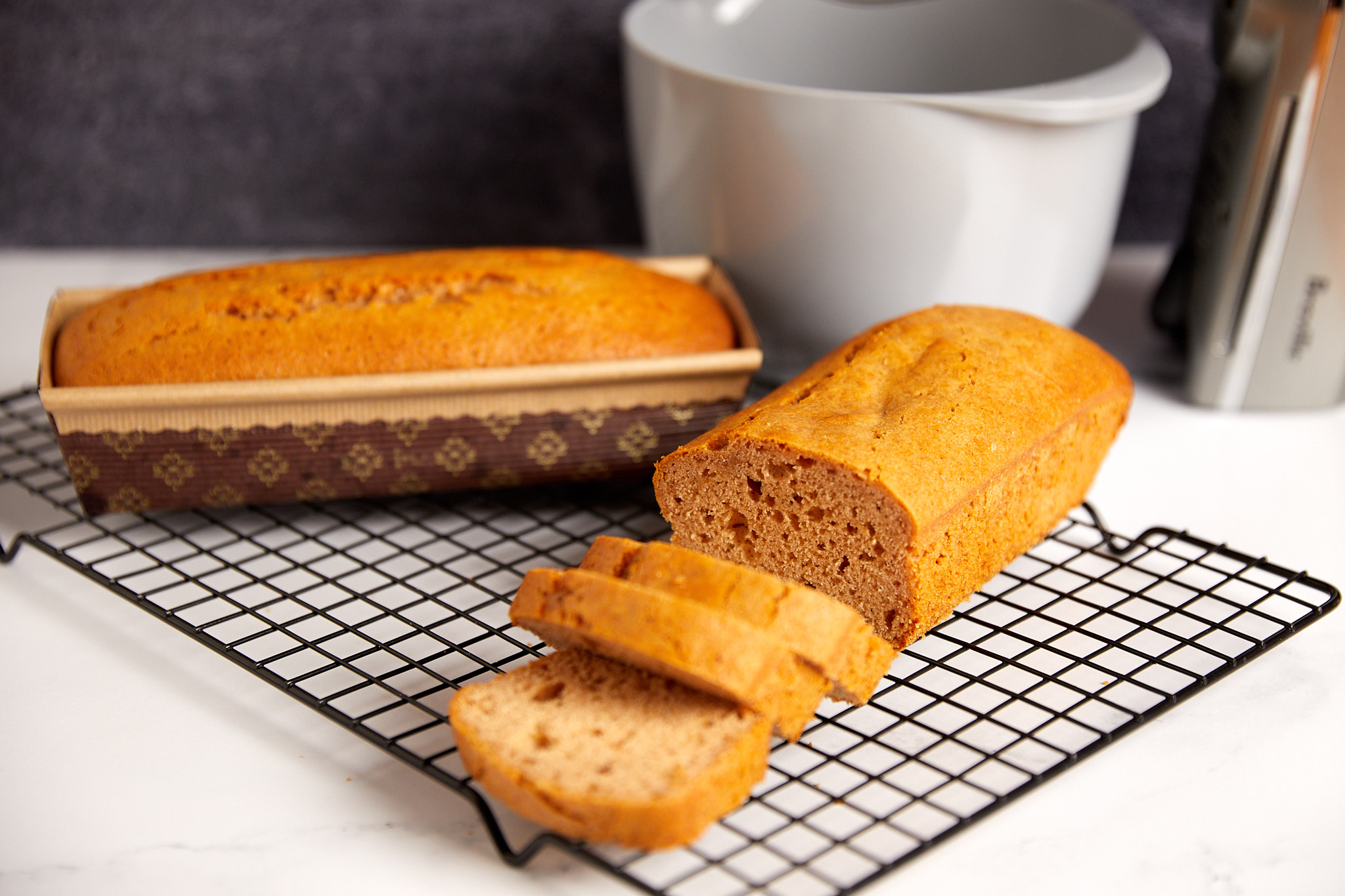 Add the batter to your loaf pan, and tap it on the counter a few times to remove any airbubbles.