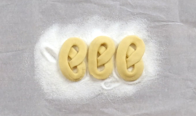 Lay 3-4 krakelingen on the sugar, lengthwise, pointing away from you.
