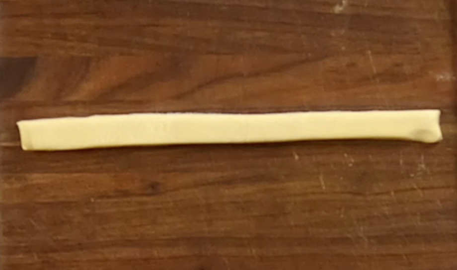 Shaping the krakelingen seems difficult, but it's pretty easy. Lay one strip of your puff pastry in front of you, on your work surface, horizontally.